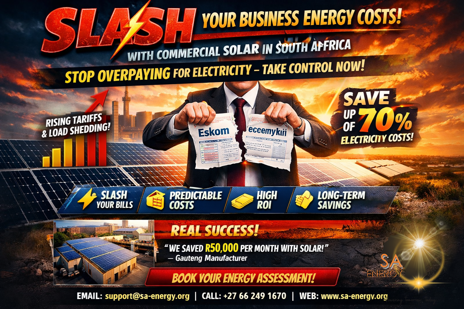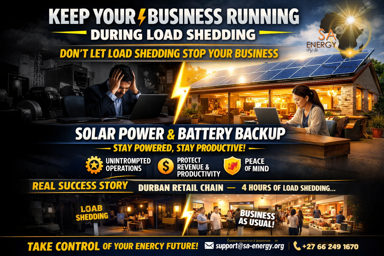 ⚡ Don’t Let Load Shedding Stop Your Business Load shedding is more than an inconvenience — it’s a major threat to revenue, productivity, and client confidence. Every hour offline costs money and risks your business reputation. But there’s a solution: commercial solar with battery backup. Stay